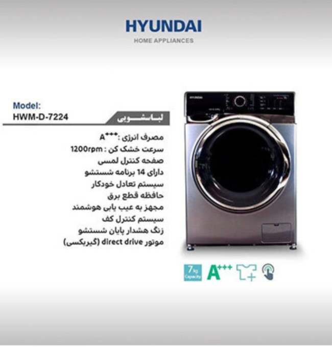 لباسشویی۷ک هیوندای دارای موتور گیربکسی مانند محصولات کره ای کم مصرف و برنامه شستشوی متنوع حباب ساز وکف ساز شستشو سریع خشک کن سریع شستشو اسلامی و... قیمت ارزان و خدمات پس از فروش بی نظیر این محصول عالی میباشد لوازم خانگی آوش این محصول را تضمین میکند
